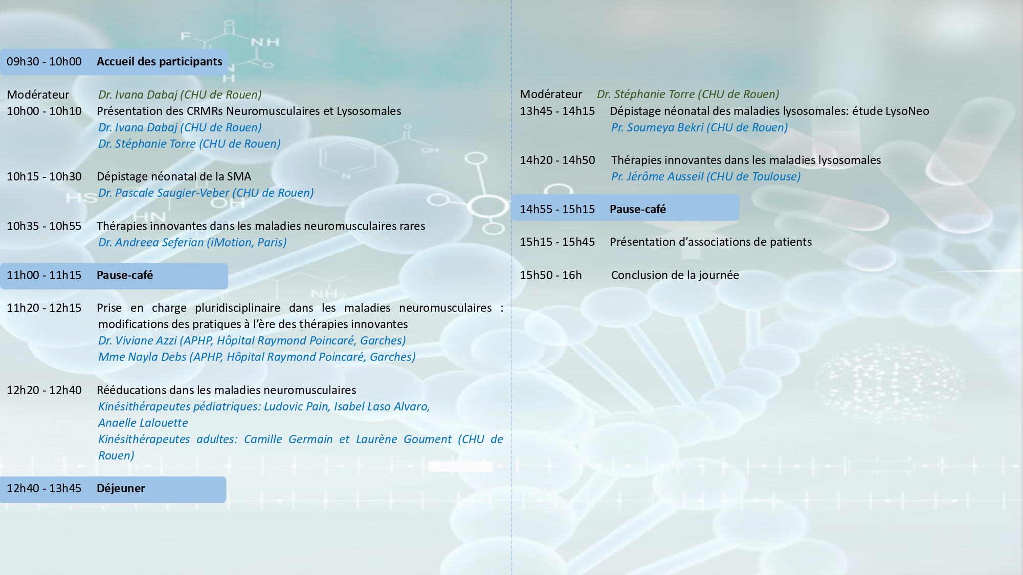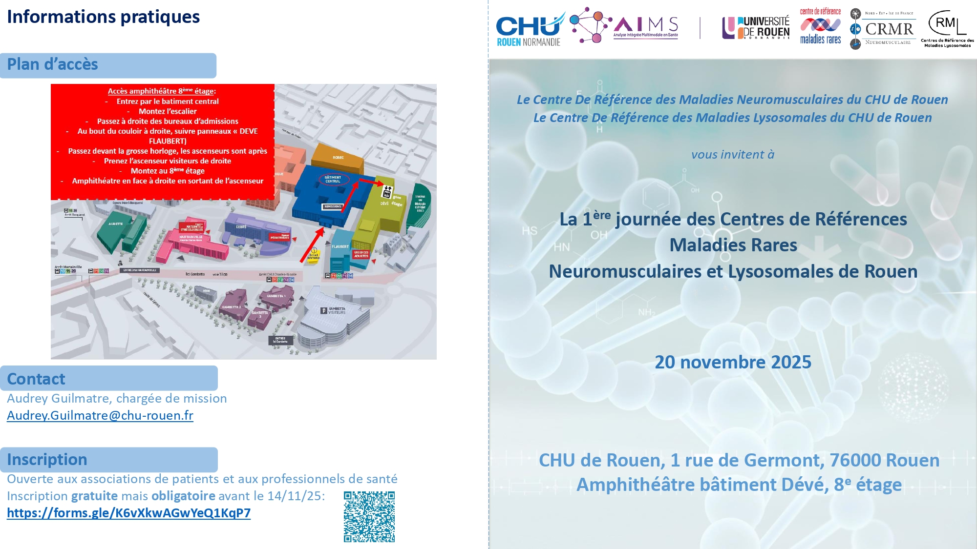 Le Centre De Référence des Maladies Neuromusculaires du CHU de Rouen et le Centre De Référence des Maladies Lysosomales du CHU de Rouen vous invite à la 1ere journée qui se déroulera le vendredi 20 novembre 2025.